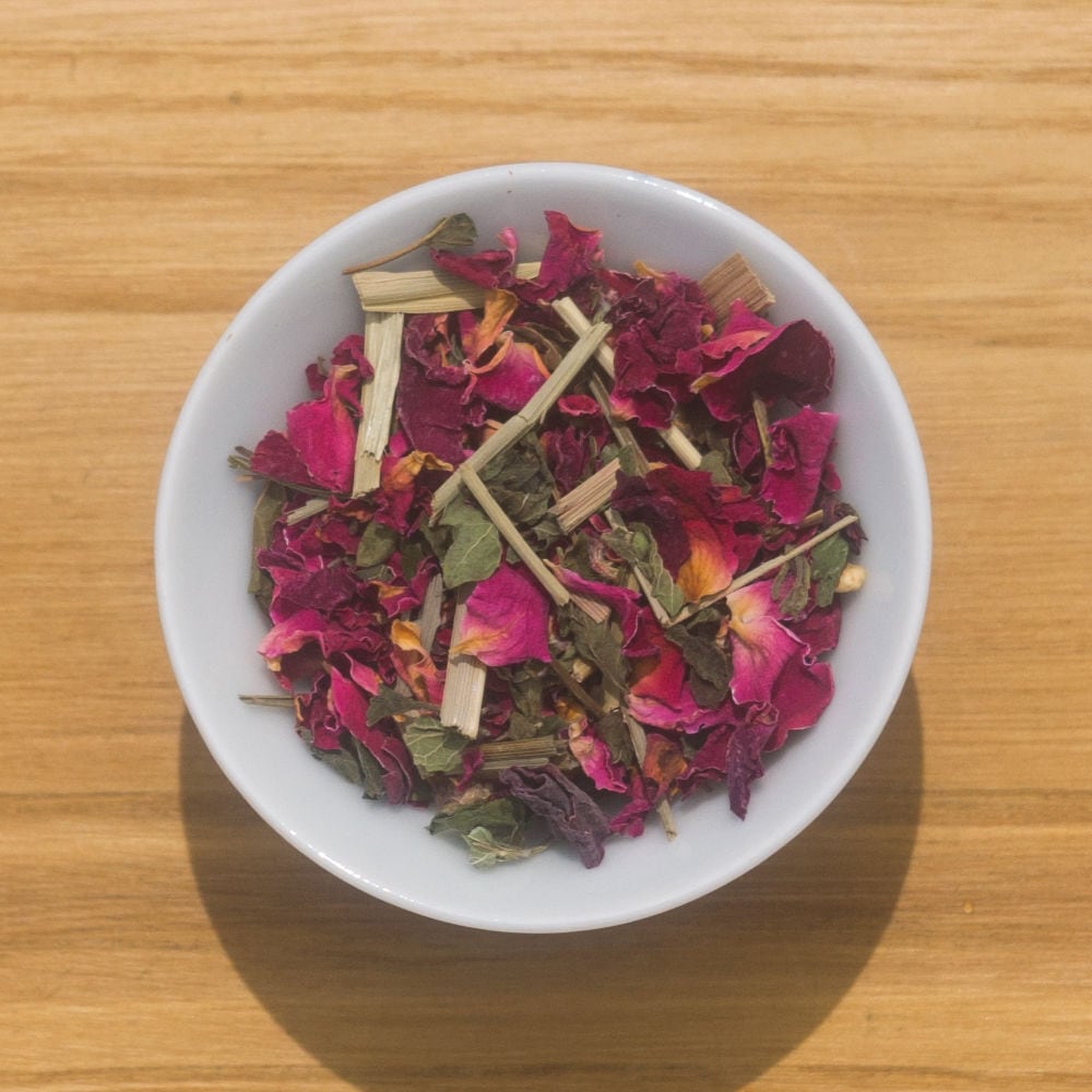 2種のローズの華やかさを、丸みをおびた優しいあまさのリンデンで調和して、やさしいブレンドにまとめました。